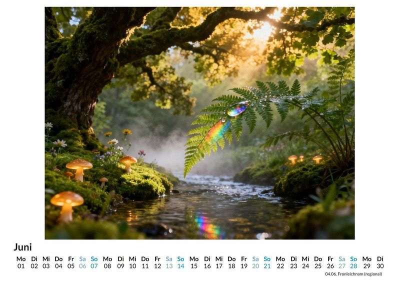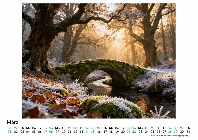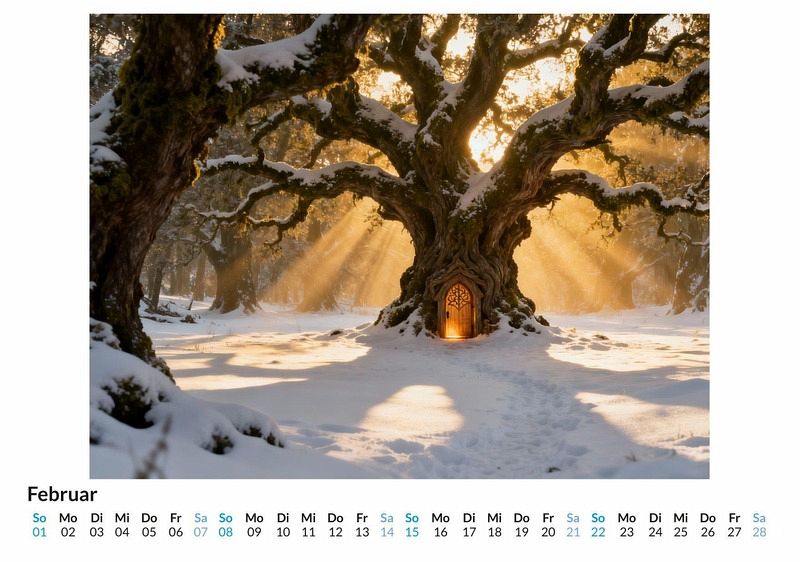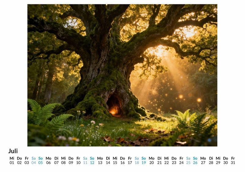 Tief in den Wäldern, wo das Sonnenlicht durch dichte Blätterdächer bricht, verbergen sich Szenen voller Magie und Stille. Es ist eine Welt, die in alten Geschichten wurzelt und in der hinter jedem Baum ein kleines Wunder wartet. Dieser Kalender fängt die besondere Atmosphäre dieser verborgenen Orte ein. Der Kalender ist eine ideale Wahl: * Für Liebhaber von Fantasie und Märchenwelten. * Für Naturfreunde, die das Mystische im Alltäglichen suchen. * Für alle, die ihre Wände mit fantasievollen Motiven schmücken möchten. Der Kalender "Märchenhafte Waldszenen" begleitet durch das Jahr mit zwölf einzigartigen Darstellungen. Leuchtende Pilze erhellen verborgene Pfade, nebelverhangene Lichtungen laden zum Verweilen ein und geheimnisvolle Waldbewohner kreuzen den Weg. Jedes Monatsbild erzählt eine eigene kleine Geschichte. Diese Bilder entspringen einer kreativen Synthese aus menschlicher Vorstellungskraft und digitaler Schöpfungskraft, was ihnen eine besondere visuelle Tiefe verleiht. Mit dem Kauf dieses Kalenders kann man Folgendes erwarten: * Zwölf Monatsmotive aus der Welt der verwunschenen Wälder. * Ein praktisches Kalendarium für die Organisation von Terminen. * Ein dekorativer Wandschmuck, der das ganze Jahr über Freude bereitet. Dieser Kalender ist eine Einladung, die stillen Wunder des Waldes Monat für Monat neu zu entdecken. Er fängt die Essenz von Sagen und Legenden in Bildern ein, die zum Träumen anregen. Ein Blick auf die Monatsansichten lohnt sich, um die Vielfalt der Motive zu sehen.
