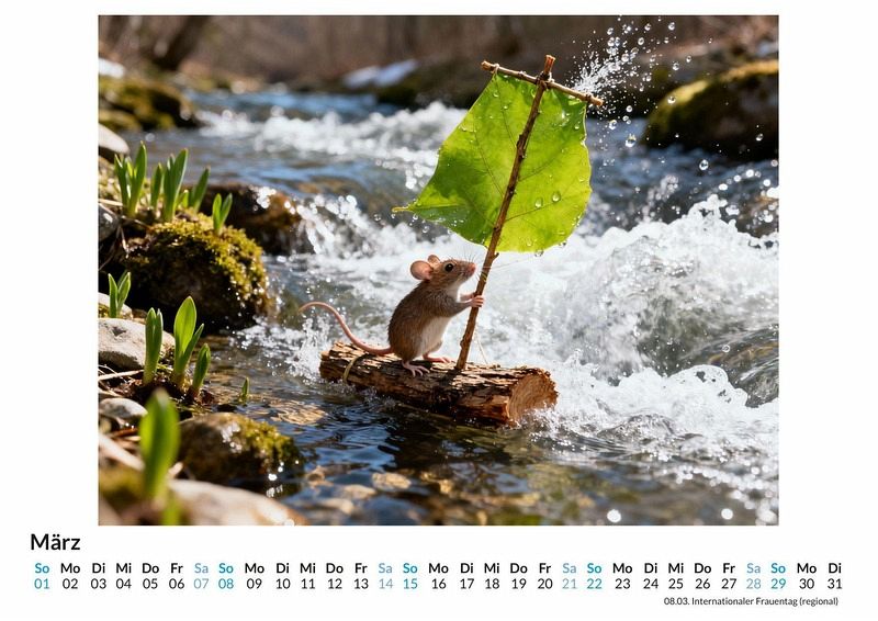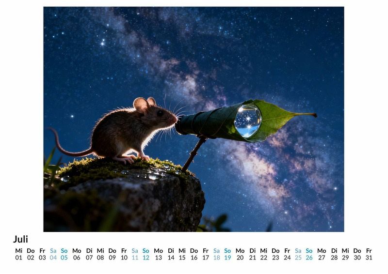 Was wäre, wenn Mäuse die Welt nicht nur aus ihrer kleinen Perspektive sehen, sondern als große Erfinder und Entdecker? Der Kalender "Mäuse-Abenteuer in Technik & Natur" gibt die Antwort und begleitet zwölf Monate lang findige Nagetiere auf ihren Expeditionen durch eine Welt voller Wunder. Dieser Kalender ist eine gute Wahl für: * Liebhaber detailreicher und fantasievoller Illustrationen * Freunde von Technik, Natur und kreativen Ideen * Alle, die ein besonderes Geschenk für neugierige Köpfe suchen Jeder Monat enthüllt eine neue Szene, in der Mäuse zu Pionieren werden. Sie konstruieren Flugapparate aus Blättern und Zweigen, navigieren mit Kompassen aus Nussschalen oder erforschen die Tiefen eines Gartenteichs in selbstgebauten Tauchglocken. Die Motive, die aus einer Synthese von menschlicher Idee und digitaler Schöpfungskraft entstanden sind, zeigen eine Welt voller Witz und Erfindergeist. Die detailverliebten Zeichnungen laden zum genauen Betrachten ein und erzählen kleine Geschichten von Mut und Einfallsreichtum. Mit dem Kauf dieses Kalenders kann man Folgendes erwarten: * Zwölf Monatsblätter mit einzigartigen Mäuse Motiven * Ein praktisches Kalendarium für die Jahresplanung * Ein dekorativer Wandschmuck, der zum Schmunzeln anregt Der Kalender "Mäuse-Abenteuer in Technik & Natur" ist mehr als nur ein Zeitplaner. Er ist eine monatliche Einladung in eine Welt, in der die kleinsten Lebewesen die größten Ideen haben. Eine Entdeckungsreise für das ganze Jahr, die zeigt, was mit Neugier und ein wenig Fantasie alles möglich ist. Es lohnt sich, einen Blick auf die einzelnen Monatsmotive zu werfen.