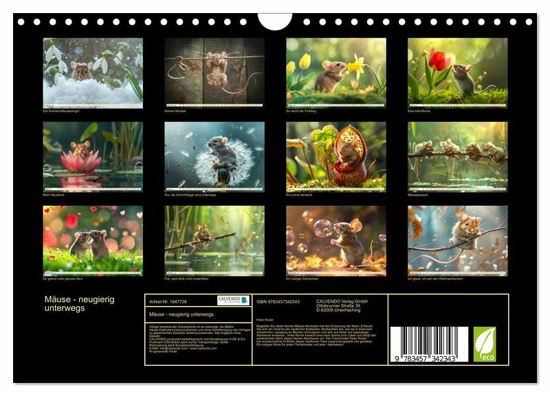 Begleiten Sie diese kleinen Mäuse-Akrobaten bei der Eroberung der Natur. Erfreuen Sie sich am Charme der niedlichen Entdecker. Beobachten Sie, wie sie in Seerosen schwimmen, neugierig an Blumen schnuppern und sich auf Ästen auf waghalsige Abenteuer einlassen. Jeder Monat erweckt eine neue Szene zum Leben und fängt den spielerischen Geist dieser kleinen Abenteurer ein. Der Fotokünstler Peter Roder hat wunderschöne KI-Bilder dieser niedlichen Tiere zusammengestellt und gestaltet. Ein lustiges Muss für jeden Tierliebhaber und jede -liebhaberin.