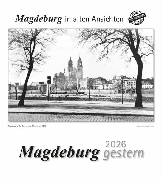 Der m+m-Wandkalender „Magdeburg gestern 2026“ präsentiert auf seinen Monatsblättern trotzdem einige Ansichten von dem alten Magdeburg. Gleich das Titelfoto zeigt einen Blick von der Elbseite in Richtung Dom um 1930. Das Januarmotiv bringt die 1928/29 erbaute Volksschule am Westring, die nur teilweise wieder aufgebaut wurde. Andere Monatsblätter zeigen weitere Gebäude und Straßenzüge wie die Lüneburger Straße, das ehemalige Kloster Unser Lieben Frauen, das ehemalige Zentral-Theater (um 1932), den früheren Staatsbürgerplatz (heute Universitätsplatz), den Breiten Weg oder die Falkenbergstraße (um 1912). Das Dezembermotiv mit einer Luftbildaufnahme aus dem Jahre 1925 zeigt dann die Magdeburger Altstadt vor hundert Jahren.