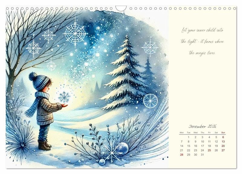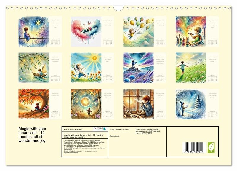QUALITY - High-quality photo calendar with 12 beautiful images on light-resistant paper, robust spiral binding with hanger.SUSTAINABLE - Significant waste reduction due to print-on-demand production, environmentally friendly FSC-certified paper, produced in the UK, climate-conscious logistical processes.PERFECT GIFT - calendars for friends and family, for children, all ages and all occasions, from Christmas to birthdays and everything in between.LOTS OF CHOICE - Wall calendars in different sizes (DIN A4 and DIN A3), for any topic and personal taste, featuring photography, painting and illustrations.A magical annual companion for your inner child, author: Michaela Spreider