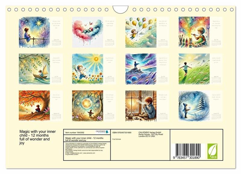 QUALITY - High-quality photo calendar with 12 beautiful images on light-resistant paper, robust spiral binding with hanger.SUSTAINABLE - Significant waste reduction due to print-on-demand production, environmentally friendly FSC-certified paper, produced in the UK, climate-conscious logistical processes.PERFECT GIFT - calendars for friends and family, for children, all ages and all occasions, from Christmas to birthdays and everything in between.LOTS OF CHOICE - Wall calendars in different sizes (DIN A4 and DIN A3), for any topic and personal taste, featuring photography, painting and illustrations.A magical annual companion for your inner child, author: Michaela Spreider