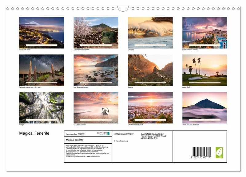 QUALITY - High-quality photo calendar with 12 beautiful images on light-resistant paper, robust spiral binding with hanger.SUSTAINABLE - Significant waste reduction due to print-on-demand production, environmentally friendly FSC-certified paper, produced in the UK, climate-conscious logistical processes.PERFECT GIFT - calendars for friends and family, for children, all ages and all occasions, from Christmas to birthdays and everything in between.LOTS OF CHOICE - Wall calendars in different sizes (DIN A4 and DIN A3), for any topic and personal taste, featuring photography, painting and illustrations.The most beautiful corners of Tenerife in awe inspiring photos, author: Raico