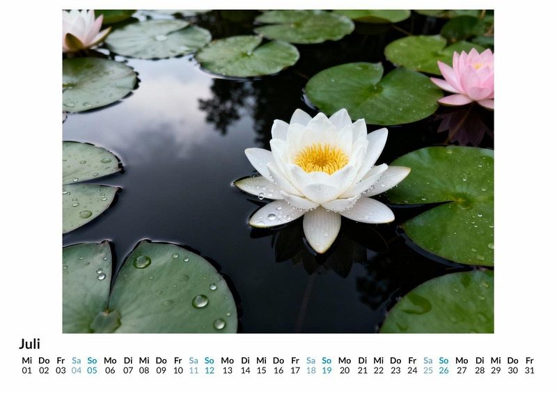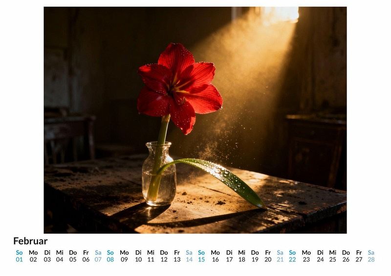 Hinter der offensichtlichen Pracht von Blüten verbirgt sich eine Welt voller Melancholie, Stärke und vergänglicher Schönheit. Der Kalender "Magie der Blumen" fängt genau diese tiefgründigen Stimmungen ein und präsentiert florale Motive in einem ungewöhnlichen Licht. Jedes Bild erzählt eine eigene, leise Geschichte, die weit über eine reine botanische Darstellung hinausgeht. Dieser Kalender ist eine ideale Wahl für: * Liebhaber von floraler Ästhetik, die das Besondere suchen. * Menschen mit einem Sinn für Design und stimmungsvolle Fotografie. * Alle, die ihre Räume mit einem ruhigen und kunstvollen Wandschmuck gestalten möchten. Die Fotografien konzentrieren sich auf das Spiel von Licht und Schatten, auf zarte Texturen und intensive Farbnuancen, die eine fast malerische Wirkung entfalten. Jedes Motiv ist eine Komposition, die aus dem Zusammenspiel von menschlicher Vision und digitaler Schöpfungskraft entstanden ist und die Grenzen zwischen Fotografie und Kunst verschwimmen lässt. Mit dem Kauf dieses Kalenders kann man Folgendes erwarten: * Zwölf sorgfältig ausgewählte Blumenmotive für jeden Monat. * Ein klares Kalendarium für die tägliche Organisation. * Eine Atmosphäre von Ruhe und Inspiration für das ganze Jahr. Der Kalender "Magie der Blumen" ist mehr als ein Zeitplaner; er ist eine monatliche Einladung, die poetische Seite der Natur zu entdecken. Er begleitet durch das Jahr mit Bildern, die zum Innehalten anregen. Ein Blick auf die Monatsblätter enthüllt die Vielfalt der dargestellten Stimmungen.