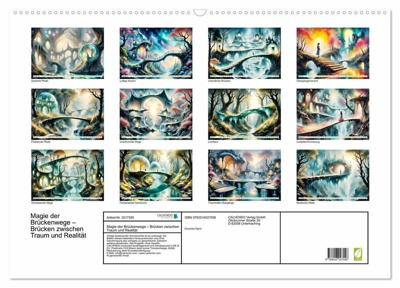 Stellen Sie sich vor, Sie treten in eine Welt ein, in der jede Brücke den Weg zu unendlichen Möglichkeiten ebnet, eine Welt, die mit modernster KI-Technologie zum Leben erweckt wurde. Dieser exklusive Kalender ist mehr als nur ein Zeitmesser, er ist ein visuelles Gedicht, das Traum und Realität ineinanderfließen lässt. Jede Seite enthüllt surreale, fast magische Brückenlandschaften, in denen das Ende einer Passage nur den Anfang einer neuen, faszinierenden Reise markiert. Diese einzigartigen Motive fordern Sie heraus, Ihren eigenen Weg zu wählen, sei es ein Sprung ins Unbekannte oder das behutsame Weitergehen auf beliebten Pfaden.