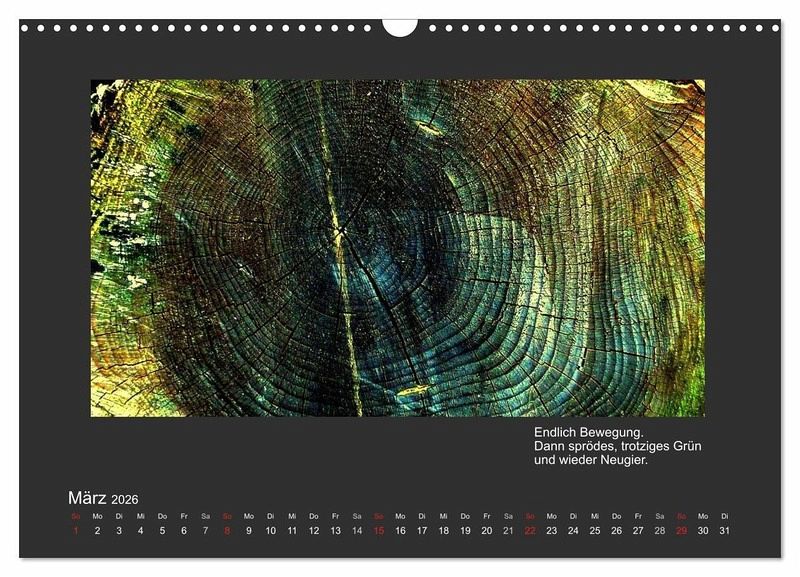 Detailaufnahmen der Schnittflächen von Baumstämmen und Haikus begleiten stimmungsvoll durch den Jahresablauf.