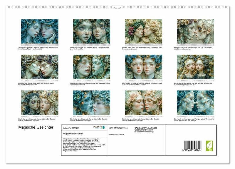 Entdecken Sie die magischen Gesichter, wo jeder Pinselstrich ein Märchen erzählt und jedes Lächeln ein Abenteuer verspricht. Tauchen Sie ein in eine Welt, in der Farben träumen und Formen flüstern. Unsere einzigartigen Kreationen verwandeln Ihr Gesicht in eine lebendige Leinwand, die Geschichten von fernen Welten, geheimen Wünschen und zauberhaften Begegnungen enthüllt. Alle hier gezeigten Bilder wurden mit Sorgfalt, Liebe und mit Hilfe einer KI generiert. Abschließend werden sie mit Bildbearbeitungsprogrammen überarbeitet und in den Kalender eingefügt.