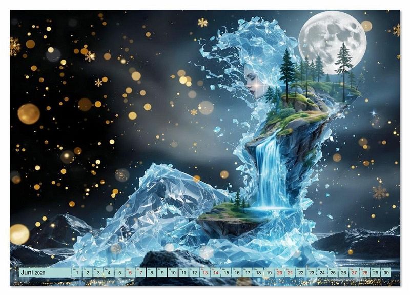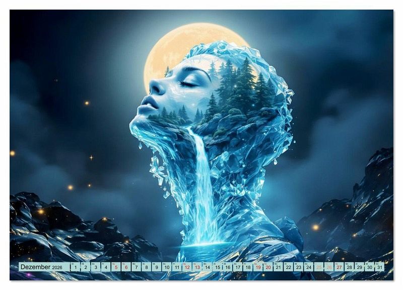 Mit KI erschaffen, webt dieser Kalender ein unsichtbares Band zwischen Technologie und Natur. Der Kalender ist ein magischer Tor zwischen Wasser, Natur und weiblicher Form. Sie spüren das Prickeln auf Ihre Haut, wenn Tropfen an Ihrem Fenster zerschellen, hören das Flüstern uralter Baumgeister und sehen das gleißende Funkeln einer Quelle, die niemals versiegt. Jeder Monat lädt Sie ein, innezuhalten, die Hektik zu vergessen und Sie tief mit der Urkraft allen Seins zu verbinden.