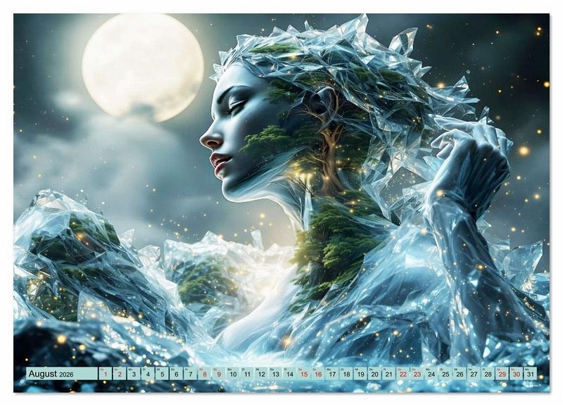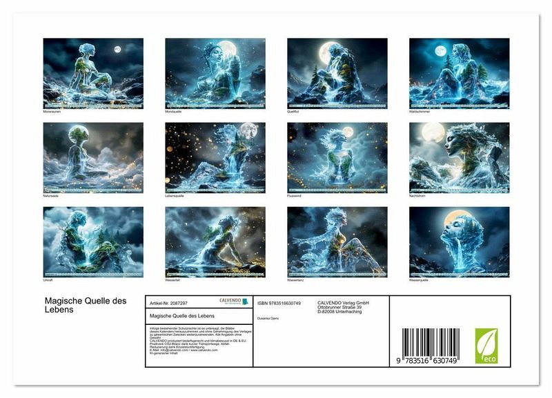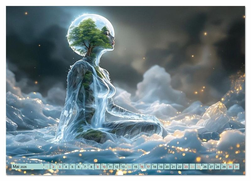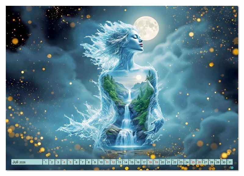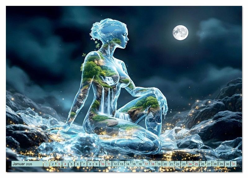 Mit KI erschaffen, webt dieser Kalender ein unsichtbares Band zwischen Technologie und Natur. Der Kalender ist ein magischer Tor zwischen Wasser, Natur und weiblicher Form. Sie spüren das Prickeln auf Ihre Haut, wenn Tropfen an Ihrem Fenster zerschellen, hören das Flüstern uralter Baumgeister und sehen das gleißende Funkeln einer Quelle, die niemals versiegt. Jeder Monat lädt Sie ein, innezuhalten, die Hektik zu vergessen und Sie tief mit der Urkraft allen Seins zu verbinden.