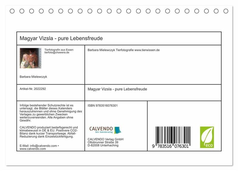 QUALITÄT - Hochwertiger Fotokalender mit 12 wunderschönen Motiven auf lichtbeständigem Bilderdruckpapier, robuste Spiralbindung.NACHHALTIG - deutliche Abfallreduzierung durch bedarfsgerechte Einzelstückfertigung, umweltfreundliches FSC-zertifiziertes Papier, Produktion in Deutschland, klimabewusste Logistik.PERFEKTES GESCHENK - Kalender für Freunde und Familie, für Kinder und Erwachsene, jung und alt, zu Weihnachten, Geburtstag oder zwischendurch.VIELFALT - Bildkalender in verschiedenen Formaten, z.B. DIN A5, DIN A4, DIN A3 sowie DIN A2. Ob Naturmotiv, Gemälde oder Fotos, ideal für ein persönliches Wohlfühlambiente.Hunderassenkalender Magyar Vizsla mit 13 schönen Fotos von Autor(in): Barbara Mielewczyk