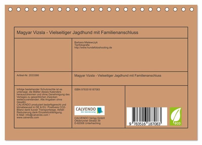 QUALITÄT - Hochwertiger Fotokalender mit 12 wunderschönen Motiven auf lichtbeständigem Bilderdruckpapier, robuste Spiralbindung.NACHHALTIG - deutliche Abfallreduzierung durch bedarfsgerechte Einzelstückfertigung, umweltfreundliches FSC-zertifiziertes Papier, Produktion in Deutschland, klimabewusste Logistik.PERFEKTES GESCHENK - Kalender für Freunde und Familie, für Kinder und Erwachsene, jung und alt, zu Weihnachten, Geburtstag oder zwischendurch.VIELFALT - Bildkalender in verschiedenen Formaten, z.B. DIN A5, DIN A4, DIN A3 sowie DIN A2. Ob Naturmotiv, Gemälde oder Fotos, ideal für ein persönliches Wohlfühlambiente.Kalendermit schönen Fotos der Hunderasse Magyar Vizsla von Autor(in): Barbara Mielewczyk