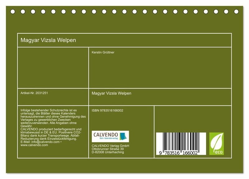 QUALITÄT - Hochwertiger Fotokalender mit 12 wunderschönen Motiven auf lichtbeständigem Bilderdruckpapier, robuste Spiralbindung.NACHHALTIG - deutliche Abfallreduzierung durch bedarfsgerechte Einzelstückfertigung, umweltfreundliches FSC-zertifiziertes Papier, Produktion in Deutschland, klimabewusste Logistik.PERFEKTES GESCHENK - Kalender für Freunde und Familie, für Kinder und Erwachsene, jung und alt, zu Weihnachten, Geburtstag oder zwischendurch.VIELFALT - Bildkalender in verschiedenen Formaten, z.B. DIN A5, DIN A4, DIN A3 sowie DIN A2. Ob Naturmotiv, Gemälde oder Fotos, ideal für ein persönliches Wohlfühlambiente.Magyar Vizsla Welpen - eine Rasse mit Charme und Herz von Autor(in): K. Grüttner