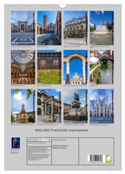 Mailand ist bekannt für einzigartige sakrale Bauten, imposante Paläste, zahlreiche Skulpturen, eindrucksvolle Plätze und das weltberühmte Opernhaus Scala. Viele Spuren aus der Antike sind in der italienischen Stadt zu finden. Entdecken Sie mit diesem Kalender die faszinierende Schönheit der lombardischen Hauptstadt in 12 ausgewählten Motiven.