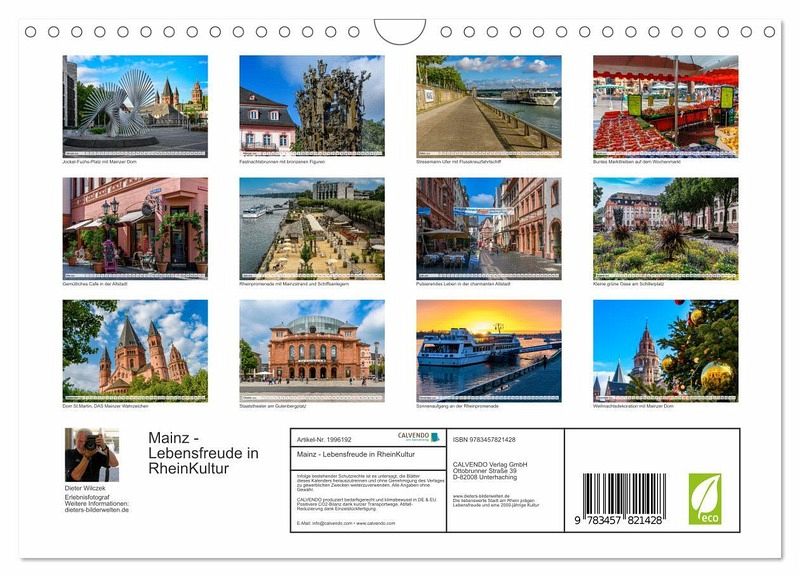 Das sehenswerte Mainz ist Lebenslust und Kultur am Rhein. Der Erlebnisfotograf Dieter Wilczek hat die Stadt mit ihrem ganz eigenen, unwiderstehlichen Charme schätzen und lieben gelernt. Deshalb besucht er sie seit vielen Jahren und zu verschiedenen Jahreszeiten. Seine schönsten Motive hat er in diesem Kalender zusammen gestellt.