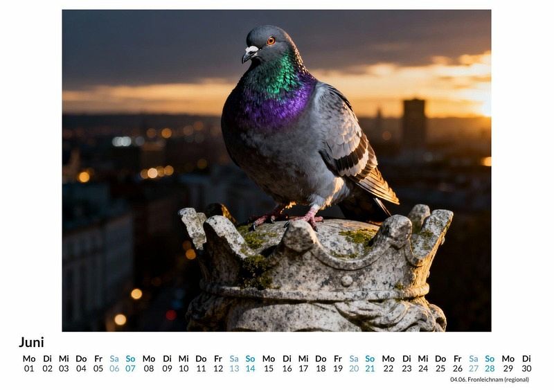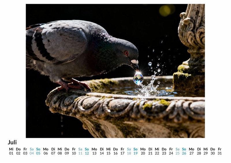 Oft übersehen, im städtischen Trubel kaum beachtet - Stadttauben. Dieser Kalender bricht mit der gewohnten Wahrnehmung und enthüllt die verborgene Eleganz dieser Vögel durch dramatisch ausgeleuchtete Porträtaufnahmen. Dieser Kalender ist eine ausgezeichnete Wahl: * Für Liebhaber der urbanen Tierwelt, die das Besondere im Alltäglichen suchen. * Für Freunde der Fotografie und ungewöhnlicher Porträtkunst. * Für alle, die ein originelles und nachdenklich stimmendes Geschenk schätzen. Der Kalender "Majestätische Tauben" rückt die oft verkannten Vögel der Stadt in ein völlig neues Licht. Vor dunklem Hintergrund, in einer Lichtführung, die an die alten Meister erinnert, entfalten die Tauben eine ungeahnte Würde. Jedes Porträt fängt einen einzigartigen Charakter ein. Die Porträts sind das Ergebnis eines Zusammenspiels aus menschlicher Idee und der schöpferischen Kraft von Algorithmen. Das Ergebnis sind zwölf Persönlichkeiten, die den Betrachter mit Stolz und Gelassenheit anblicken. Was der Kalender bietet: * Zwölf Monatsmotive, die Stadttauben als aristokratische Charaktere zeigen. * Ein praktisches Kalendarium für die Organisation von Terminen. * Ein Wandschmuck, der das ganze Jahr über für Gesprächsstoff sorgt. Dieser Kalender ist eine Hommage an die verborgene Anmut, die uns täglich umgibt. Er lädt dazu ein, die Perspektive zu wechseln und Schönheit dort zu entdecken, wo man sie am wenigsten erwartet. Ein Blick auf die Monatsansichten enthüllt die volle Pracht dieser gefiederten Majestäten.