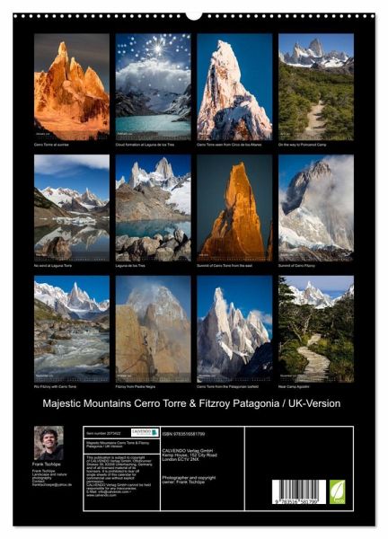 PREMIUM COLLECTION - Brilliant photo calendar with 12 beautiful motifs, high-gloss art print in museum quality.QUALITY - high-quality materials, sturdy back cover with 2 innovative insert pockets for optimum presentation on the wall.SUSTAINABLE - significant reduction in waste thanks to customised one-off production, environmentally friendly FSC-certified paper, production in Germany, climate-conscious logistics.PERFECT GIFT - calendars for friends and family, for children and adults, young and old, for Christmas, birthdays or in between.A selection of unique pictures from Cerro Torre and Cerro Fitzroy von Autor(in): Frank Tschöpe