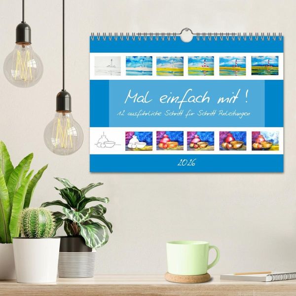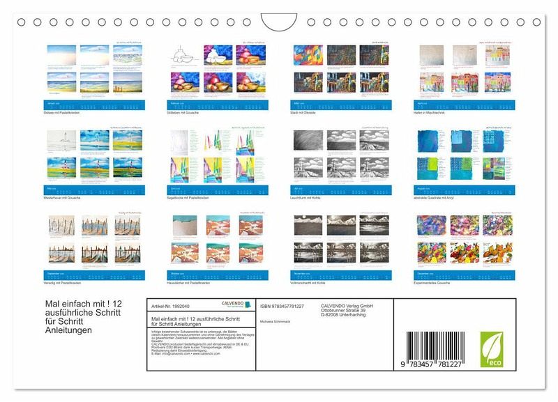 "Mal einfach mit" ist eine Einladung für alle Menschen, die "einfach nur Lust zum Malen haben" und vielleicht nicht recht wissen, wie sie anfangen sollen. Die schrittweise angeleiteten Bilder des Kalenders sind so konzipiert, dass auch ein absoluter Anfänger ein ansehnliches Ergebnis erzielen wird! Die von mir selbst gemalten und schrittweise mitfotografierten Bilder habe ich bereits in vielen Kursen angeleitet und freue mich immer wieder wenn ein nicht geübter Maler voller Stolz sein Werk mit nach Hause nimmt. Viel Freude mit ihren 12 Bildern!