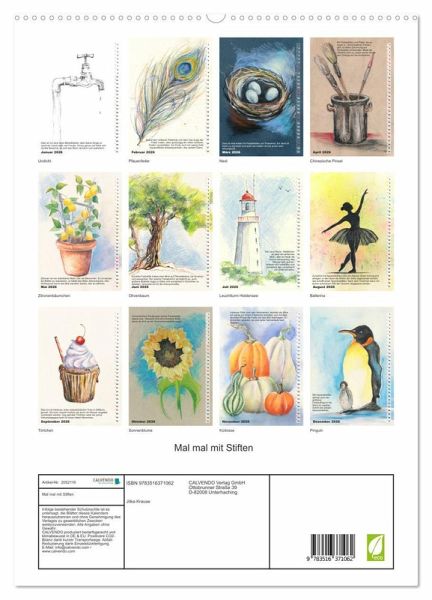 Dieser Kalender bietet für alle, die Spaß am Zeichnen und Malen mit Stiften haben oder es immer schon mal probieren wollten, einfache aber wirkungsvolle Motive. Jitka Krause, Künstlerin und Mallehrerin, bietet allen Anregung und gibt Tips zur leichteren Umsetzung. Stifte sind praktisch, leicht mitzunehmen und bieten viele Möglichkeiten zur Kreativität.