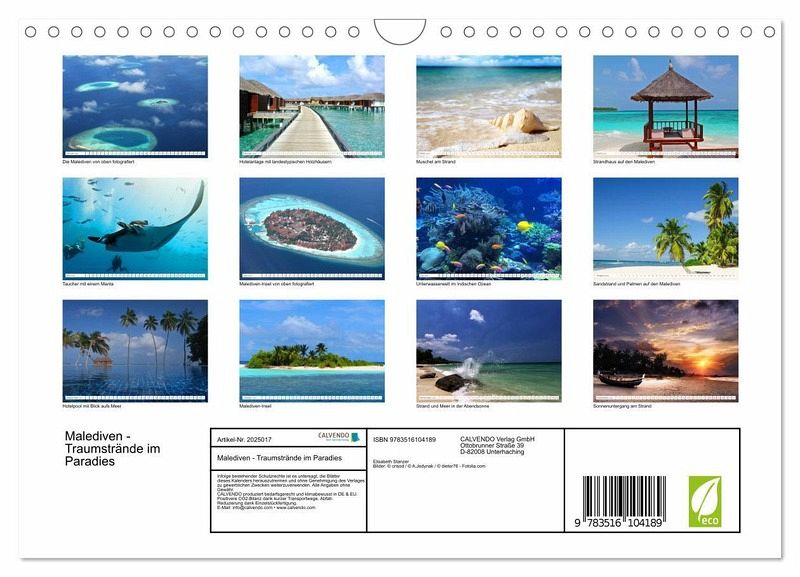 QUALITÄT - Hochwertiger Fotokalender mit 12 wunderschönen Motiven auf lichtbeständigem Bilderdruckpapier, robuste Spiralbindung mit Aufhängebügel.NACHHALTIG - deutliche Abfallreduzierung durch bedarfsgerechte Einzelstückfertigung, umweltfreundliches FSC-zertifiziertes Papier, Produktion in Deutschland, klimabewusste Logistik.PERFEKTES GESCHENK - Kalender für Freunde und Familie, für Kinder und Erwachsene, jung und alt, zu Weihnachten, Geburtstag oder zwischendurch.VIELFALT - Bildkalender in verschiedenen Formaten, z.B. DIN A5, DIN A4, DIN A3 sowie DIN A2. Ob Naturmotiv, Gemälde oder Fotos, ideal für ein persönliches Wohlfühlambiente.Die traumhafte Inselwelt der Malediven für Erholungssuchende und Taucher von Autor(in): Elisabeth Stanzer