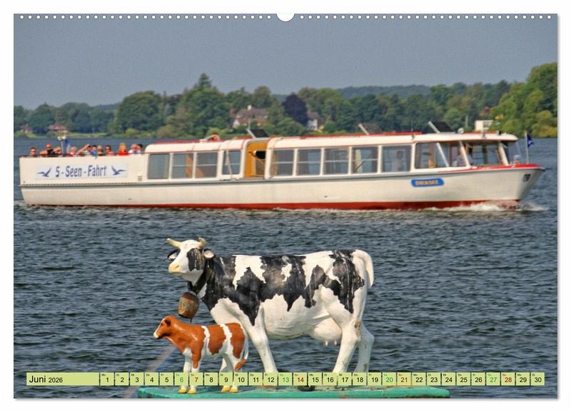 Juni: Ein Schiff der 5 Seen Fahrt passiert schwimmende Kunstkühe