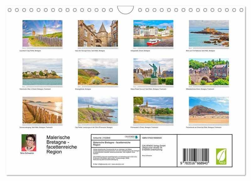 Dieser Kalender zeigt die Schönheit und Einzigartigkeit der Bretagne - eine vielseitige Region in Frankreich, die für ihre schroffe Atlantikküste, grüne Landschaften im Hinterland und ihre charmanten Hafenstädte bekannt ist. Lassen Sie sich inspirieren und gehen Sie mit auf eine Entdeckungsreise.