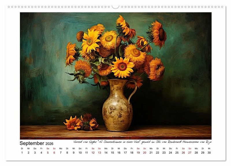 September: Vincent van Goghs "12 Sonnenblumen in einer Vase" gemalt im Stil von Rembrandt Harmenszoon van Rijn