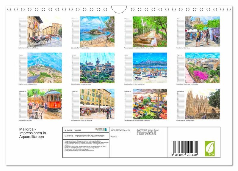 QUALITÄT - Hochwertiger Fotokalender mit 12 wunderschönen Motiven auf lichtbeständigem Bilderdruckpapier, robuste Spiralbindung mit Aufhängebügel.NACHHALTIG - deutliche Abfallreduzierung durch bedarfsgerechte Einzelstückfertigung, umweltfreundliches FSC-zertifiziertes Papier, Produktion in Deutschland, klimabewusste Logistik.PERFEKTES GESCHENK - Kalender für Freunde und Familie, für Kinder und Erwachsene, jung und alt, zu Weihnachten, Geburtstag oder zwischendurch.VIELFALT - Bildkalender in verschiedenen Formaten, z.B. DIN A5, DIN A4, DIN A3 sowie DIN A2. Ob Naturmotiv, Gemälde oder Fotos, ideal für ein persönliches Wohlfühlambiente.Illustrierte Ansichten der sonnigen Baleareninsel von Autor(in): Anja Frost