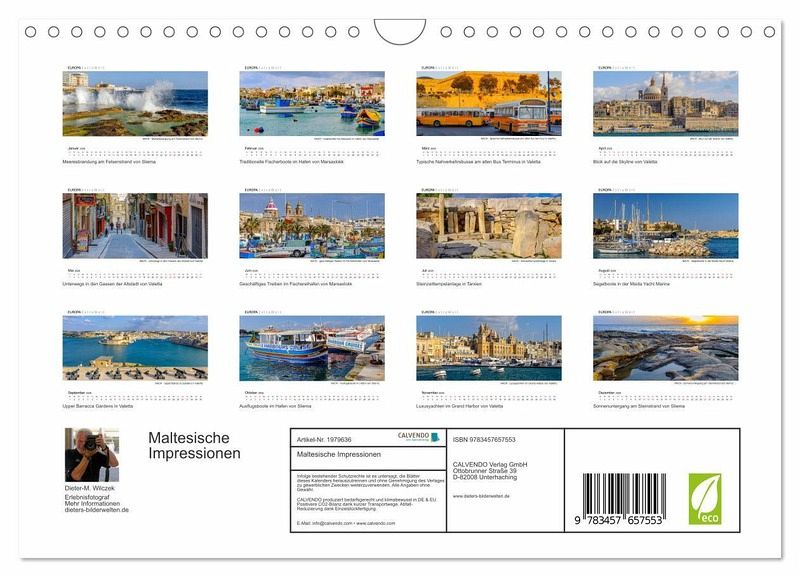 In der Kalenderserie von Dieter-M. Wilczek "EUROPA Extra Weit" zeigt der Erlebnisfotograf die faszinierenden Städte & Landschaften Europas in besonders ausdrucksstarken Panoramabildern. Wie seine Aufnahmen belegen, hat der Inselstaat Malta seinen ganz eigenen unwiderstehlichen Charme. Lassen Sie sich begeistern und holen Sie sich ein Stück mediterranes Flair nach Hause.