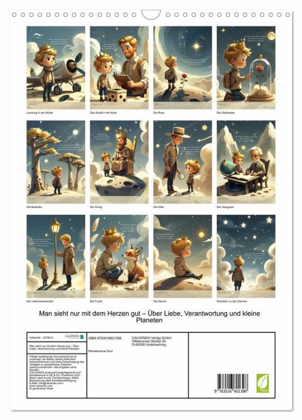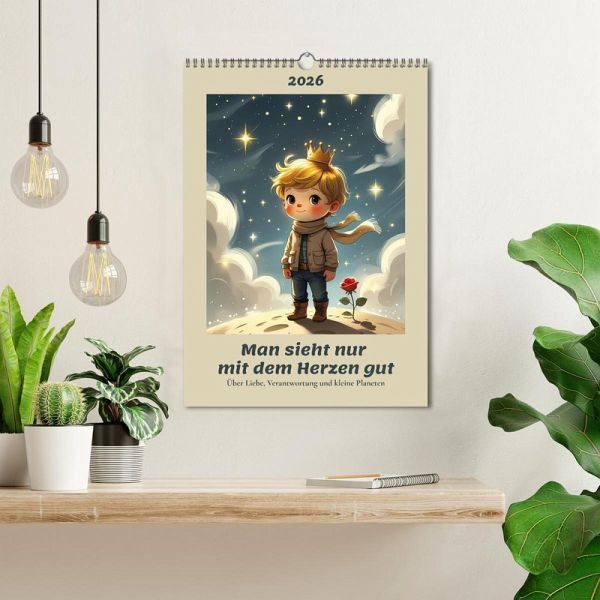 QUALITÄT - Hochwertiger Fotokalender mit 12 wunderschönen Motiven auf lichtbeständigem Bilderdruckpapier, robuste Spiralbindung mit Aufhängebügel.NACHHALTIG - deutliche Abfallreduzierung durch bedarfsgerechte Einzelstückfertigung, umweltfreundliches FSC-zertifiziertes Papier, Produktion in Deutschland, klimabewusste Logistik.PERFEKTES GESCHENK - Kalender für Freunde und Familie, für Kinder und Erwachsene, jung und alt, zu Weihnachten, Geburtstag oder zwischendurch.VIELFALT - Bildkalender in verschiedenen Formaten, z.B. DIN A5, DIN A4, DIN A3 sowie DIN A2. Ob Naturmotiv, Gemälde oder Fotos, ideal für ein persönliches Wohlfühlambiente.Eine poetische Bilderreise, inspiriert vom kleinen Prinzen - über Freundschaft, Verantwortung und das, was man nur mit dem Herzen sieht. von Autor(in): Renaissance Soul
