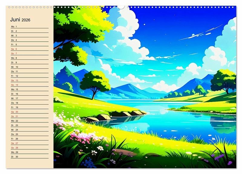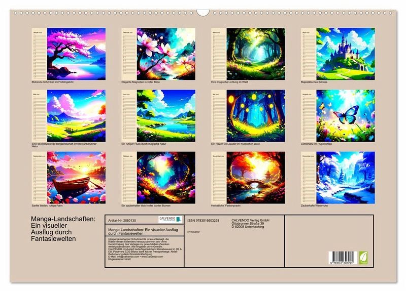 Tauchen Sie Monat für Monat in atemberaubende Landschaften im einzigartigen Manga-Stil (Ki generiert) ein und lassen Sie sich von fantasievollen Welten verzaubern. Mit liebevoll gestalteten Illustrationen bringen Sie Farbe und Inspiration in Ihren Alltag. Ob für die Planung Ihrer Termine oder einfach zum Träumen - dieser Kalender verbindet Kunst, Fantasie und Organisation auf eine ganz besondere Weise. Gönnen Sie sich ein Jahr voller magischer Landschaften und lassen Sie Ihrer Kreativität freien Lauf!
