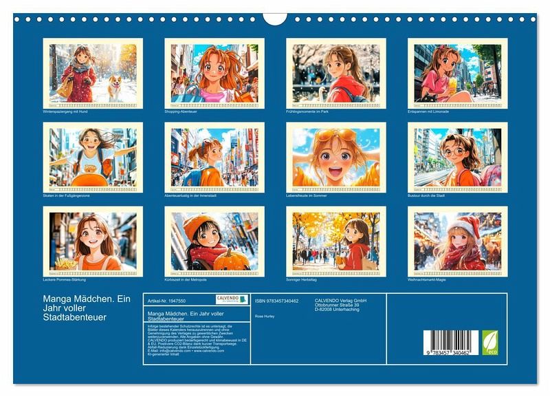 Dieser schöne Manga-Kalender wurde mithilfe von KI erstellt und zeigt die farbenfrohen und fröhlichen Momente des Stadtlebens durch die Augen eines niedlichen Manga-Mädchens. Jede Seite offenbart eine neue Szene aus ihrem Alltag in der Großstadt - vom Spaziergang im Winter bis zum sonnigen Tag im Park. Begleite sie durch die Jahreszeiten und erlebe, wie vielseitig und aufregend das Leben in der Stadt sein kann. Ein Kalender, der jeden Monat ein Lächeln ins Gesicht zaubert.