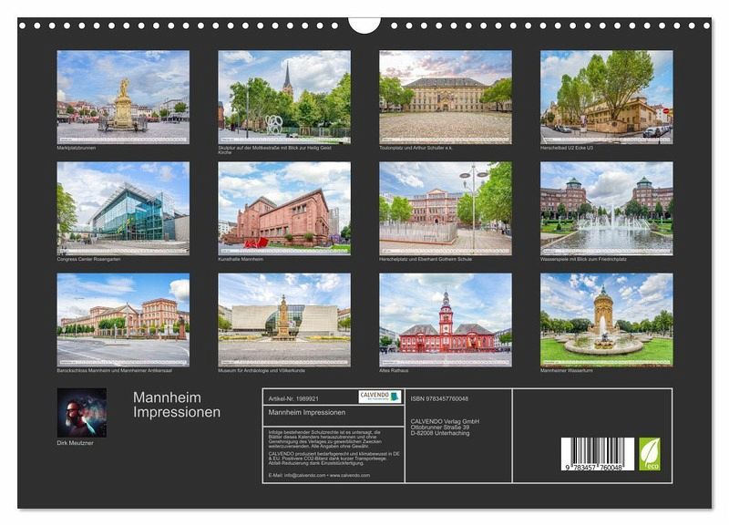 Die Stadt Mannheim, dargestellt auf zwölf einzigartig farbenprächtigen Aufnahmen des Fotografen Dirk Meutzner. Die Universitätsstadt Mannheim ist eine Stadt mit 309.370 Einwohnern im Regierungsbezirk Karlsruhe in Baden-Württemberg. Sie ist nach Stuttgart und Karlsruhe die drittgrößte Stadt des Landes.