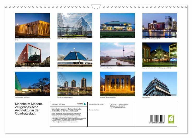 Mannheim wurde im Zweiten Weltkrieg stark zerstört. Nach dem Krieg bis hinein in die Gegenwart wurden wichtige Bauten in zeitgenössischem Stil wiedererrichtet, neue Bauten kamen hinzu und prägen das Stadtbild ebenso wie die der bekannte Wasserturm oder andere "Klassiker". Dieser Kalender zeigt Ihnen einige wichtige Beispiele dieser neuen, modernen Architektur der Quadratestadt an Rhein und Neckar.