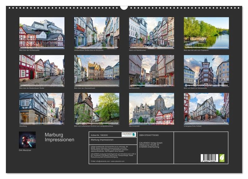 Der Fotograf Dirk Meutzner entführt Sie mit diesem wunderschönen Kalender in die mittelhessische Kreisstadt Marburg. Sie werden Monat für Monat erstaunt sein über die Einzigartigkeit dieser schönen Universitätsstadt. Das Stadtgebiet erstreckt sich beiderseits der Lahn westlich ins Gladbacher Bergland hinein und östlich über die Lahnberge hinweg bis an den Rand des Amöneburger Beckens.