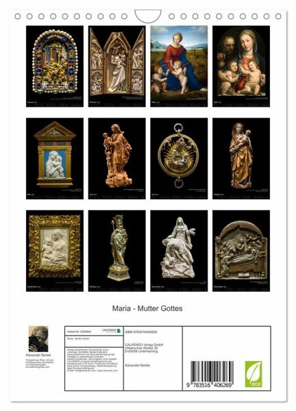 QUALITÄT - Hochwertiger Fotokalender mit 12 wunderschönen Motiven auf lichtbeständigem Bilderdruckpapier,robuste Spiralbindung mit Aufhängebügel.NACHHALTIG - deutliche Abfallreduzierung durch bedarfsgerechte Einzelstückfertigung, umweltfreundliches FSC-zertifiziertes Papier, Produktion in Deutschland, klimabewusste Logistik.PERFEKTES GESCHENK - Kalender für Freunde und Familie, für Kinder und Erwachsene, jung und alt, zu Weihnachten, Geburtstag oder zwischendurch.VIELFALT - Bildkalender in verschiedenen Formaten, z.B. DIN A5, DIN A4, DIN A3 sowie DIN A2. Ob Naturmotiv, Gemälde oder Fotos, ideal für ein persönliches Wohlfühlambiente.Die hl. Maria - in verschiedenen Darstellungsformen der Kunst von Autor(in): Alexander Bartek