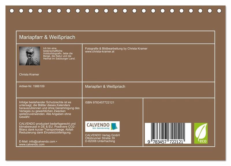 QUALITÄT - Hochwertiger Fotokalender mit 12 wunderschönen Motiven auf lichtbeständigem Bilderdruckpapier, robuste Spiralbindung.NACHHALTIG - deutliche Abfallreduzierung durch bedarfsgerechte Einzelstückfertigung, umweltfreundliches FSC-zertifiziertes Papier, Produktion in Deutschland, klimabewusste Logistik.PERFEKTES GESCHENK - Kalender für Freunde und Familie, für Kinder und Erwachsene, jung und alt, zu Weihnachten, Geburtstag oder zwischendurch.VIELFALT - Bildkalender in verschiedenen Formaten, z.B. DIN A5, DIN A4, DIN A3 sowie DIN A2. Ob Naturmotiv, Gemälde oder Fotos, ideal für ein persönliches Wohlfühlambiente.Impressionen von den Bergen in Mariapfarr und Weißpriach von Autor(in): Christa Kramer