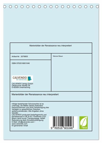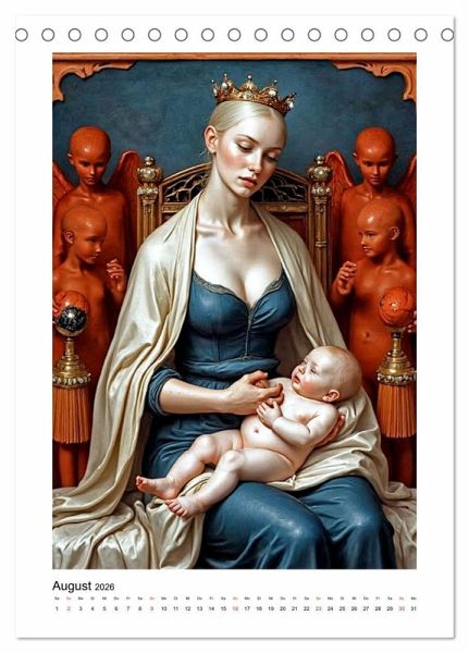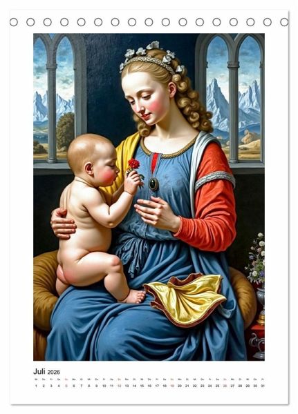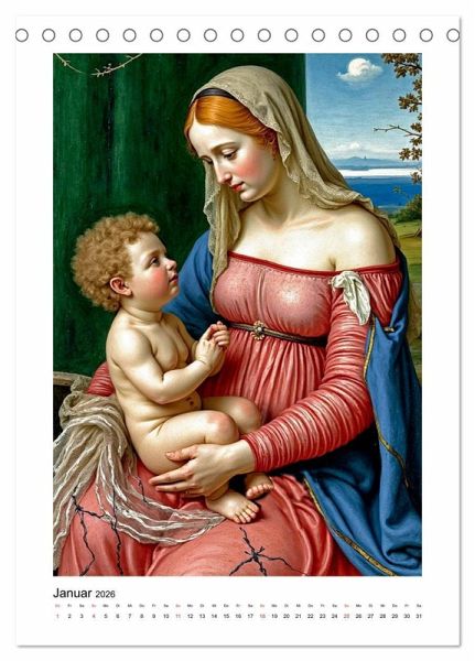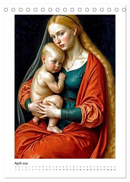 Unser Kalender präsentiert ikonische Mariendarstellungen von da Vinci bis Cranach in frischer KI-Interpretation. Erleben Sie, wie fast 600 Jahre alte Meisterwerke ihre menschliche Zärtlichkeit offenbaren. Ohne die Kunst der alten Meister zu beeinträchtigen, können die Kalenderbilder den Fokus auf eine berührende Mutter-Kind-Beziehung legen. Ein eindringlicher Brückenschlag zwischen Vergangenheit und Zukunft, der die Renaissancekunst neu erstrahlen lässt. Einzigartig, bewegend, zeitgemäß.