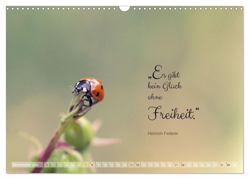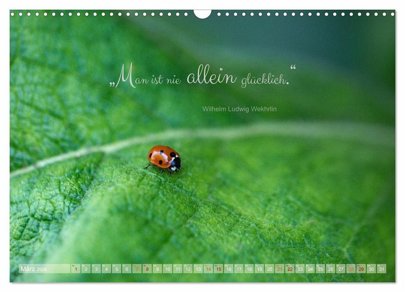 Ein Kalender voller Glück: Tauchen Sie ein in die Welt der Marienkäfer. Die Fotografin hat sie allesamt in ihrer natürlichen Umgebung aufgenommen. Lassen Sie sich von den lebendigen Farben der Motive bezaubern. Jeder Monat präsentiert Ihnen einen kleinen Glücksboten mit dem Zitat eines berühmten Denkers. Diese weisen Botschaften laden Sie zu glücklichen Momenten in Ihrem Leben ein.