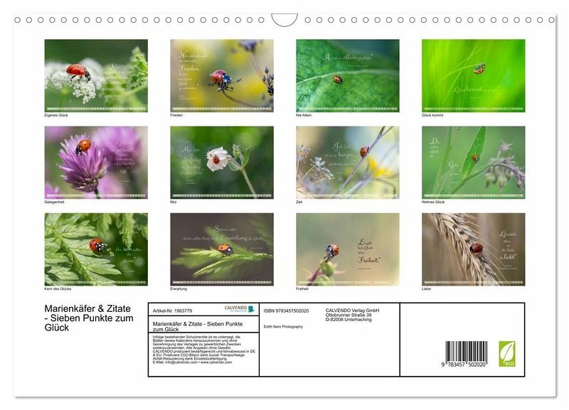 QUALITÄT - Hochwertiger Fotokalender mit 12 wunderschönen Motiven auf lichtbeständigem Bilderdruckpapier, robuste Spiralbindung mit Aufhängebügel.NACHHALTIG - deutliche Abfallreduzierung durch bedarfsgerechte Einzelstückfertigung, umweltfreundliches FSC-zertifiziertes Papier, Produktion in Deutschland, klimabewusste Logistik.PERFEKTES GESCHENK - Kalender für Freunde und Familie, für Kinder und Erwachsene, jung und alt, zu Weihnachten, Geburtstag oder zwischendurch.VIELFALT - Bildkalender in verschiedenen Formaten, z.B. DIN A5, DIN A4, DIN A3 sowie DIN A2. Ob Naturmotiv, Gemälde oder Fotos, ideal für ein persönliches Wohlfühlambiente.Glückskäfer-Kalender: Zitate und Fotos von Autor(in): Edith Nero Photography