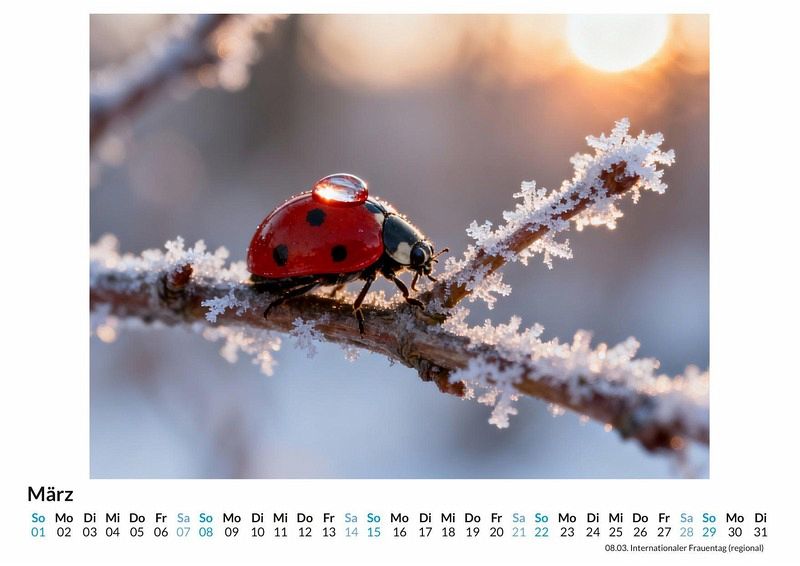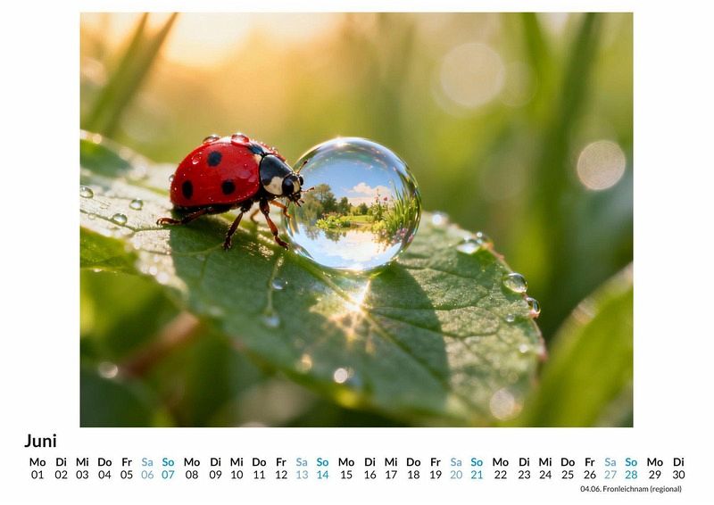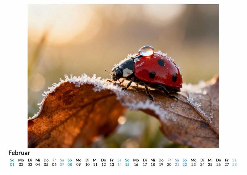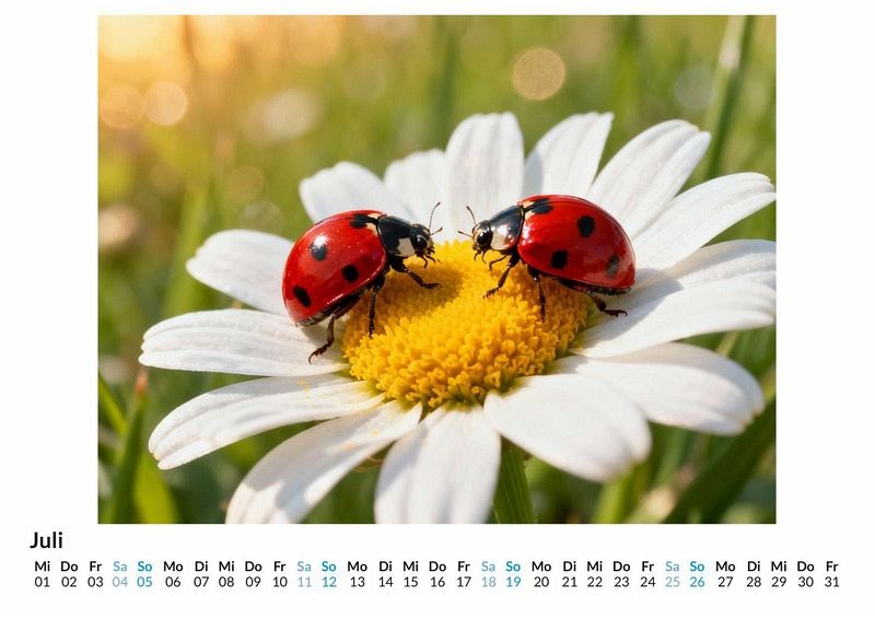 Ein flüchtiger Moment des Glücks, festgehalten für ein ganzes Jahr. Der Anblick eines Marienkäfers auf einem Grashalm oder einer Blüte weckt oft eine kindliche Freude und gilt als gutes Omen. Der Kalender "Marienkäfer" widmet sich diesem kleinen Glücksbringer und präsentiert ihn in zwölf abwechslungsreichen Szenen, die das ganze Jahr über begleiten. Dieser Kalender ist eine gute Wahl: Für Liebhaber der Natur und ihrer kleinen Wunder. Als Geschenkidee für Menschen, denen man eine Portion Glück wünscht. Für alle, die sich an detailreichen Darstellungen erfreuen. Jeder Monat enthüllt eine neue Perspektive auf den gepunkteten Käfer. Die Motive zeigen ihn in seiner natürlichen Umgebung, mal auf einem tautropfenbesetzten Blatt, mal im Anflug auf eine farbenfrohe Blüte oder in einer Gruppe mit Artgenossen. Diese Bildwelten wurden durch die kreative Kraft von Algorithmen erschaffen und bieten eine besondere Sicht auf das bekannte Insekt. Die Kompositionen spielen mit Licht, Schärfe und Detailreichtum, um die zarte Struktur der Flügel und die leuchtenden Farben hervorzuheben. Was dieser Kalender bietet: Zwölf Monatsmotive rund um den Marienkäfer. Ein praktisches Kalendarium für die Jahresplanung. Eine Sammlung von Bildern, die das Thema Glücksbringer aufgreifen. Der Kalender "Marienkäfer" ist mehr als nur ein Zeitplaner. Er ist eine tägliche Erinnerung an die kleinen Freuden und das Glück, das sich oft im Verborgenen findet. Jedes Bild lädt dazu ein, für einen Augenblick innezuhalten. Eine Entdeckungsreise durch die Welt der kleinen Glücksbringer wartet darauf, betrachtet zu werden.