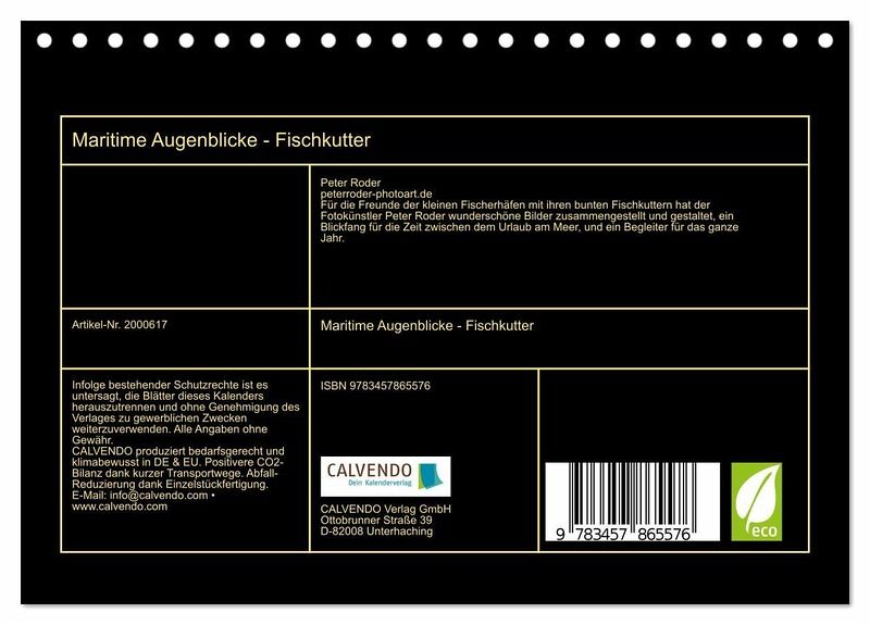 Für die Freunde der kleinen Fischerhäfen mit ihren bunten Fischkuttern hat der Fotokünstler Peter Roder wunderschöne Bilder zusammengestellt und gestaltet, ein Blickfang für die Zeit zwischen dem Urlaub am Meer, und ein Begleiter für das ganze Jahr.