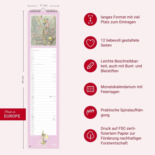 - Aus ihren Zeichnungen spricht die Liebe zur Natur: Der von Majorlein Bastin gestaltete Kalender besticht durch die vielen Details der Illustrationen- Das Rundum-Paket Marjolein Bastin: Langplaner mit anmutigen Natur-Zeichnungen und den dazu passenden Texten aus der Feder der Künstlerin- Schmal und doch ausreichend breit für alle Eintragungen: Der praktische Streifenkalender im Format 11 x 49 cm- Mit Malerei die bunte Vogelwelt ins Haus holen: Der Terminplaner von Marjolein Bastin- Geschenkideen für Gartenbesitzer: Die Natur-Kalender von Heye im Athesia Kalenderverlag