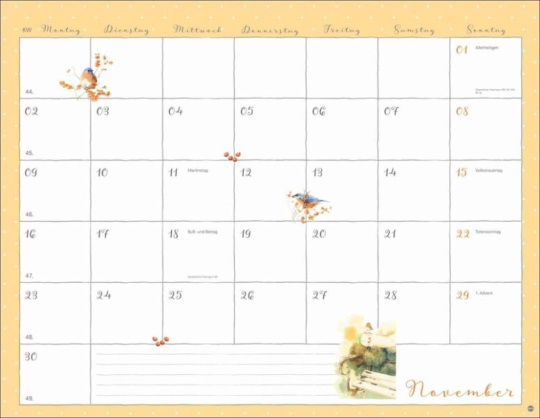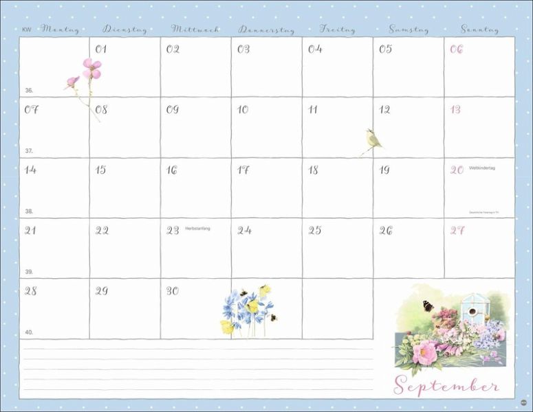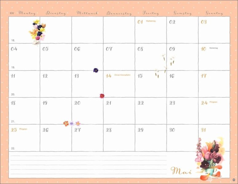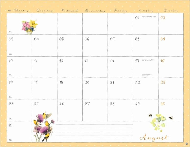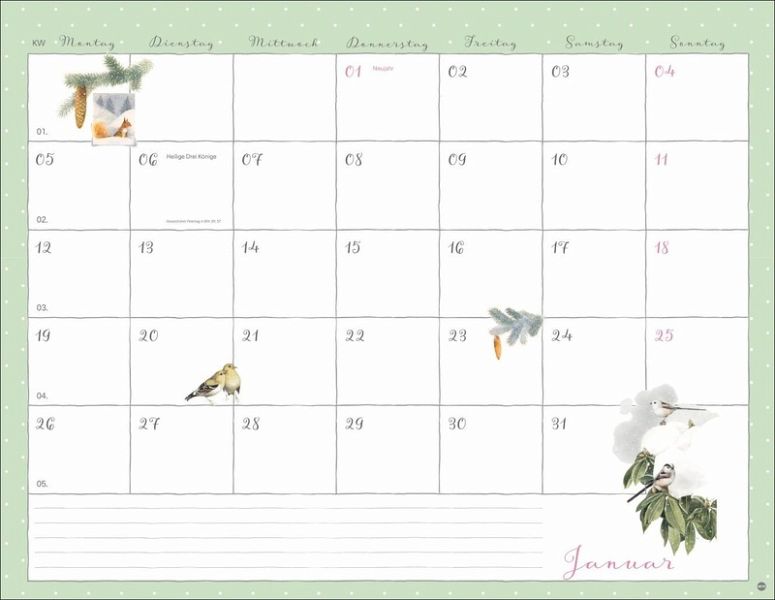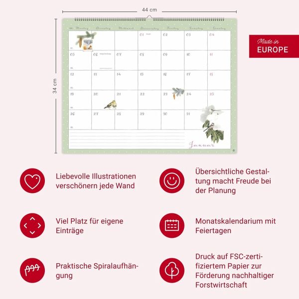 - Aus ihren Zeichnungen spricht die Liebe zur Natur: Der Marjolein-Bastin-Kalender bezaubert durch die vielen Details- Ein Monatsplaner der »Mama« von Vera der Maus, in dem der Raum für Eintragungen durch kleine Vignetten im Kalendarium aufgelockert wird- Farbenfroher Blickfang für jede Zimmerwand: Behalten Sie stets den Überblick mit dem praktischen Wandplaner-Kalender im Format 44 x 34 cm- Mit Malerei ein Stück Natur ins Haus holen: Der Monatskalender von Marjolein Bastin- Geschenkideen für Gartenbesitzer: Die Naturkalender von Heye im Athesia Kalenderverlag