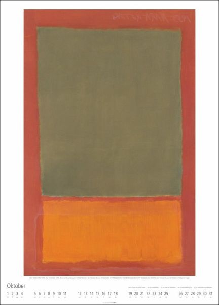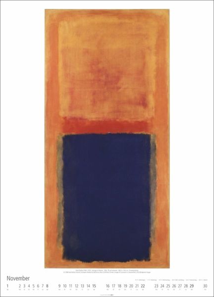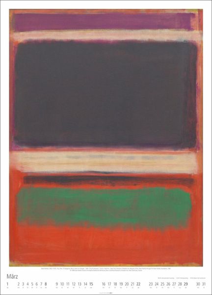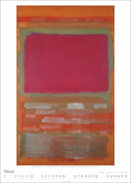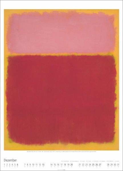 Rothko gehörte zu den Wegbereitern der Farbfeldmalerei und den bedeutendsten Repräsentanten des…mehrEs ist schon erstaunlich: der Mark-Rothko-Wandkalender ist längst ein Evergreen unter den Kunstkalendern. Bereits seit vielen Jahren gibt es immer wieder eine neue Ausgabe, stets mit neuen Motiven - Indiz dafür, wie beliebt die dekorativen Gemälde des lettisch-amerikanischen Malers (1903-1970) sind. Rothko gehörte zu den Wegbereitern der Farbfeldmalerei und den bedeutendsten Repräsentanten des Abstrakten Expressionismus, den er maßgeblich prägte.