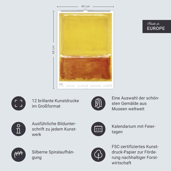 Durch die Farbigkeit und das große Format (68x49 cm) eignet sich der Kalender hervorragend als Wandschmuck. Der schmale weiße Kalenderfond mit dem äußerst dezent gehaltenen Kalendarium unterstreicht die dekorative Wirkung der einzelnen Monatsbilder noch zusätzlich. Kurzum ein Wandkalender der Extraklasse mit Gemälden aus berühmten Museen und Galerien rund um den Erdball. Bei der gediegenen Ausstattung und der Druckqualität stimmt außerdem das Preis-Leistung-Verhältnis.