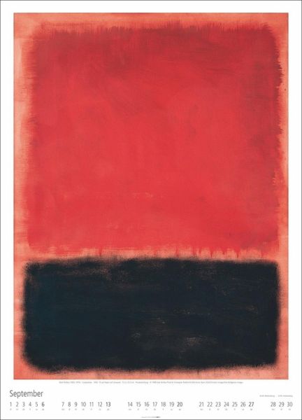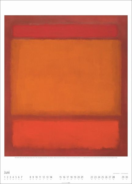Gleich das Titel- (und Juniblatt) mit dem Titel „Red, Orange, Orange on Red“ (1962) veranschaulicht Rothkos charakteristischen Stil der Farbfeldmalerei mit gestapelten, rechteckigen Farbblöcken und weichen, verschwommenen Rändern. Rothko verwendete stets intensive Farben, von warmen Rot- und Gelbtönen bis zu kalten Blau-, Grün und Brauntönen – wie z.B. bei „White and Greens Blue“ (April) oder „Homage to Matisse“ (November), das 1954, im Todesjahr des französischen Malers, entstand. Neben diesen typischen Rothko-Bildern zeigt der Kalender auf zwei Monatsblättern auch Werke aus der Frühphase des Künstlers. So belegt „No.9“ (1947) Rothkos Nutzung von Farbe und Form, um emotionale Reaktionen hervorzurufen. Alle Gemälde zielen darauf ab, beim Betrachter ein gefühlsbetontes Erlebnis hervorzurufen.