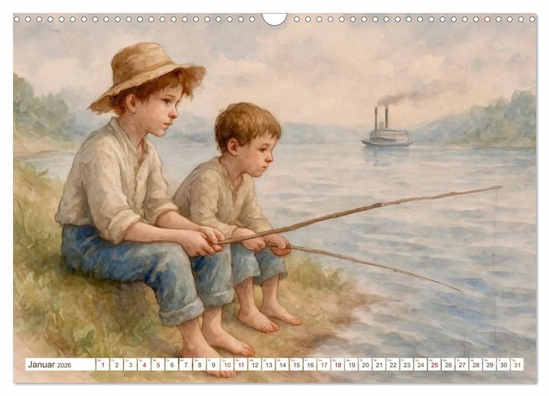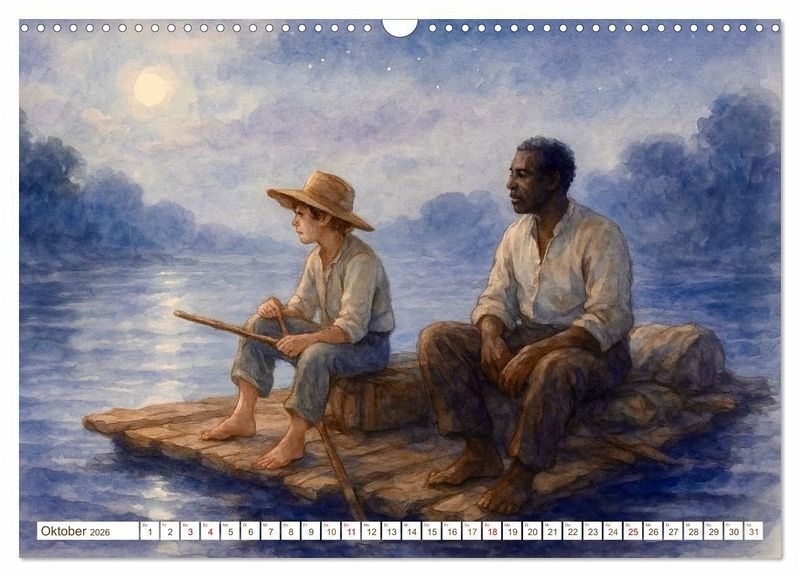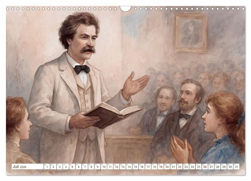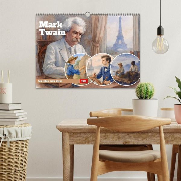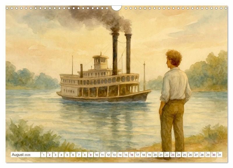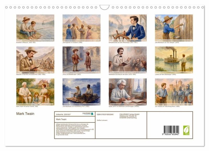 Dieser Kalender lädt ein zu einer bildgewaltigen Reise durch das Leben und Werk von Mark Twain - dem wohl bekanntesten Humoristen und Erzähler des amerikanischen 19. Jahrhunderts. Die kunstvollen Illustrationen, die Steffani Lehmann mit Unterstützung einer KI editiert hat, erzählen von Abenteuer, Gesellschaftskritik und menschlicher Tiefe. Ein besonderer Kalender für Literaturliebhaber und Amerika-Fans.