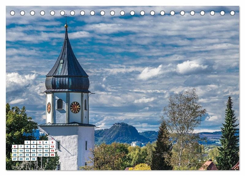 April: St.Laurentius Kirche, im Hintergrund der Berg Hohentwiel mit der gleichnamigen Burgruine