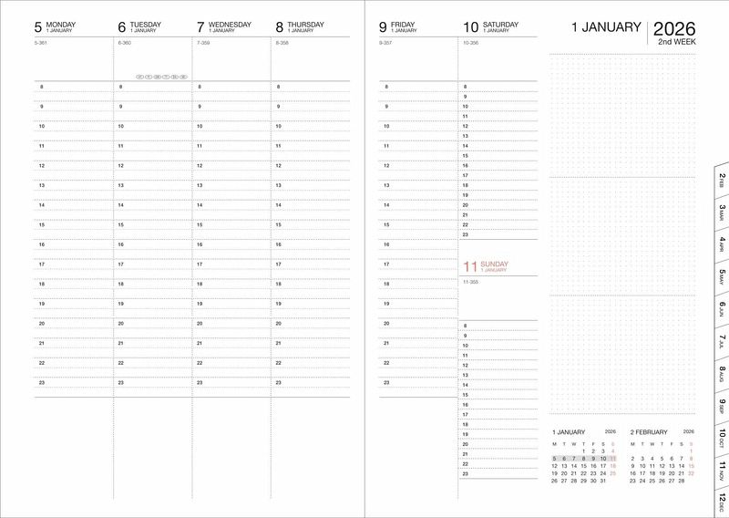 Internationaler Kalender (FSC-zertifiziertes Papier) in A5 mit patentierter Zipp-Reißverschluss-Hülle, in der sich z.B. Stifte, Tickets, Mobiltelefone praktisch verstauen lassen. Der Touchscreen von Smartphones kann durch die PVC-Hülle (produziert mit sehr reduziertem Phthalatgehalt) von außen bedient werden. Kalendarium mit 16 Monaten, beginnend mit September 2025. Internationale und deutsche Feiertage. Eine Doppelseite zum Planen pro Woche, monatliche Übersichten.