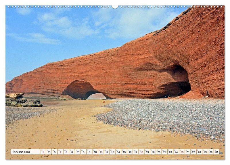 Januar: Ein riesiges Felstor aus rotem Konglomerat am Strand von Legzira an der Atlantikküste bei Sidi Ifni